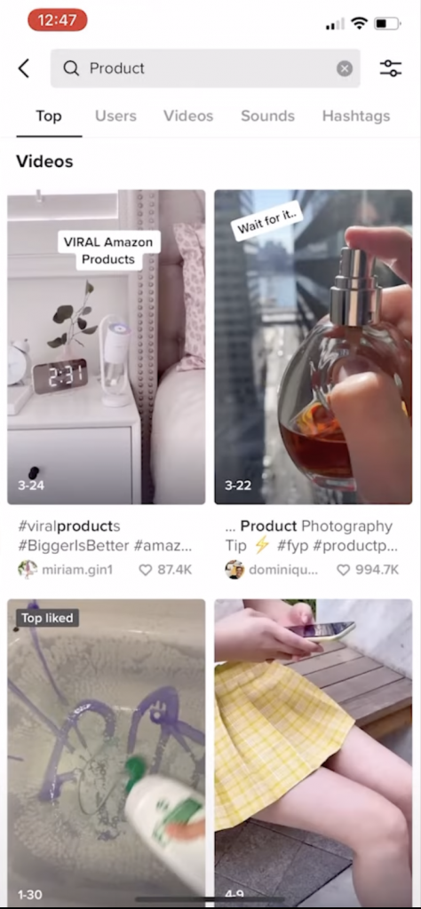 There’s probably a ton of videos in here as well, but you can just scroll through here and just look for Tiktoks that looks like there’s a product attached to it.