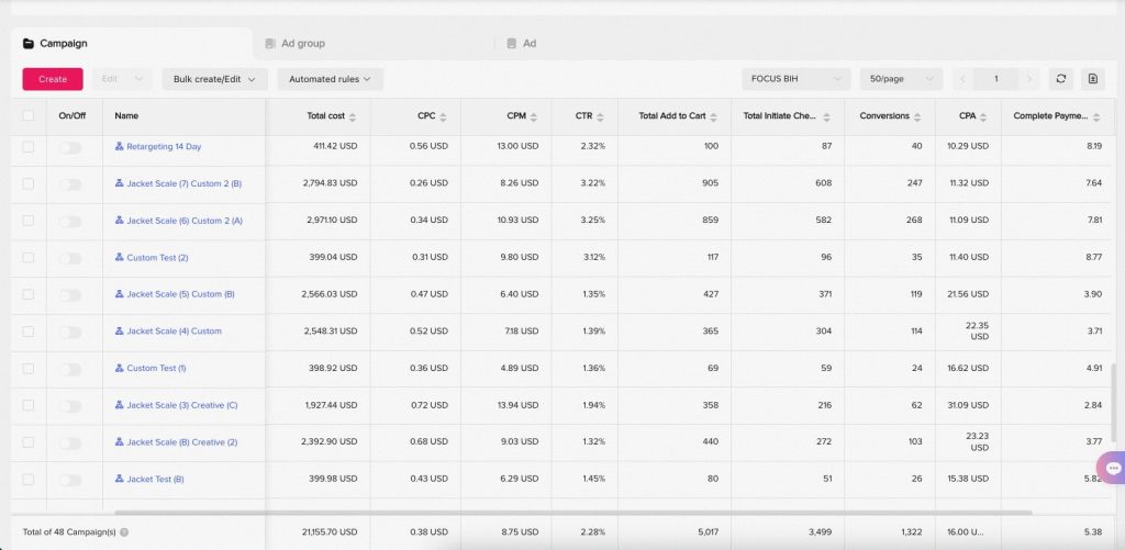 Launched 2 scale campaigns + Retargeting with the newest custom creative tested the day before.